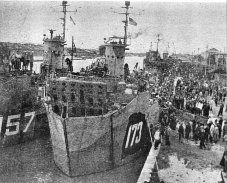 100k | USS LSM-173 and USS LSM-157 at Tientsin, China. The ship transported US Marines to rescue allied POWs and take the surrender of the Japanese garrison, 1 October 1945. Photo from "Life" Magazine, 12 November 1945. |