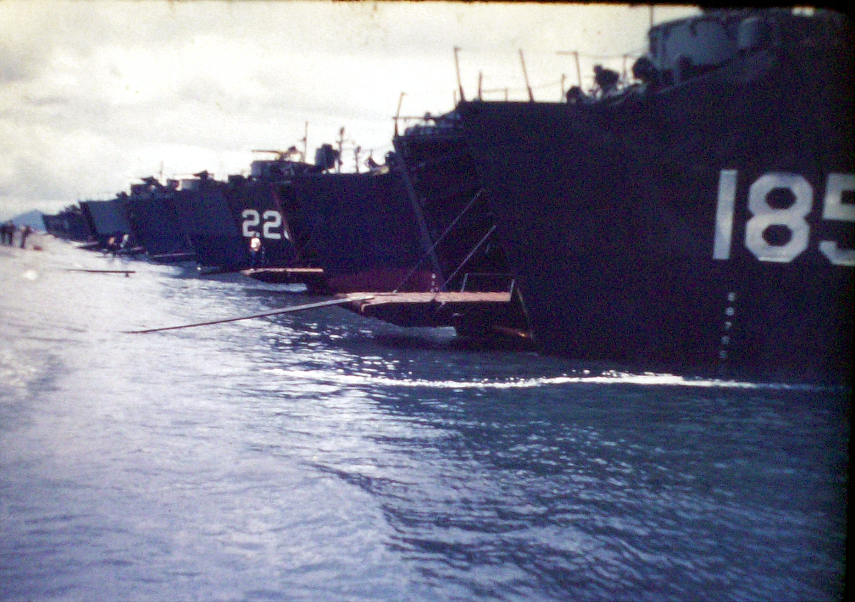 USS LSM-185 beached with other LSMs, date and location, unknown. |