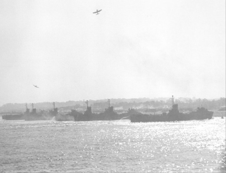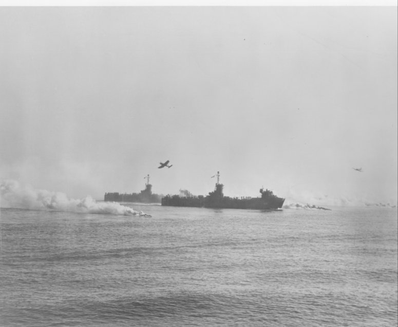 USS LSM-200 approaching the beach at Amphibious Training Base Camp Bradford, VA. during an amphibious exercise for the Army-Navy Staff College at ATB Camp Bradford, 19 February 1945. Note the smoke laying and the F4U Corsairs overhead performing strafing maneuvers. US Navy photo. |