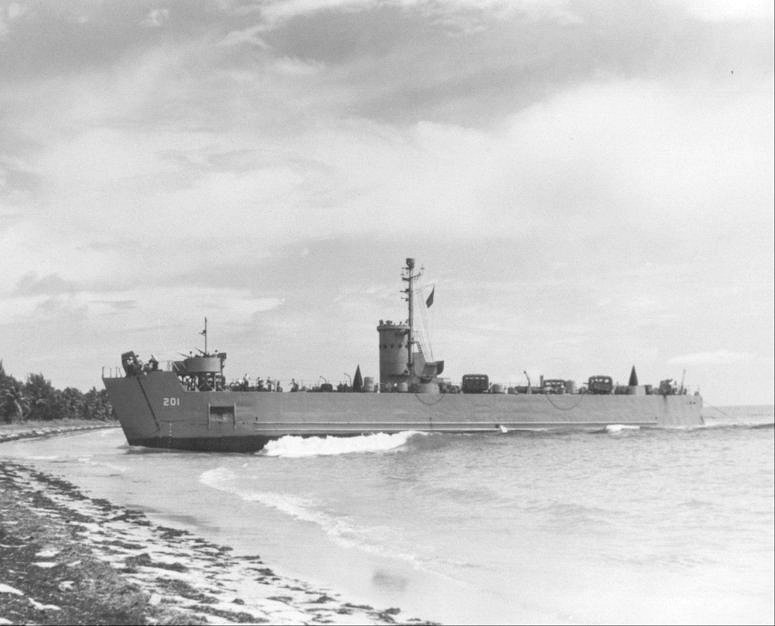 66k | USS LSM-201 beaching in the Chesapeake Bay, 30 April 1944. US Navy photo # NH 228497 from the collections of the US Naval Historical Center. |