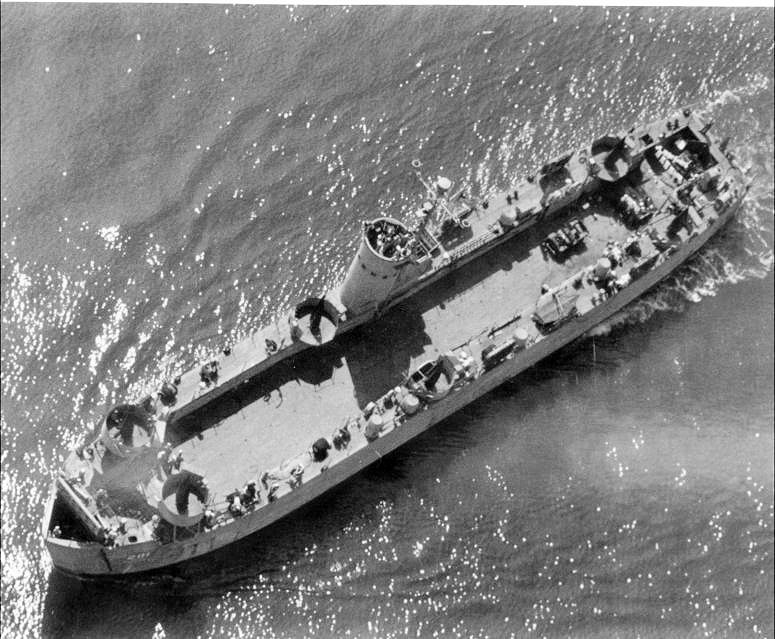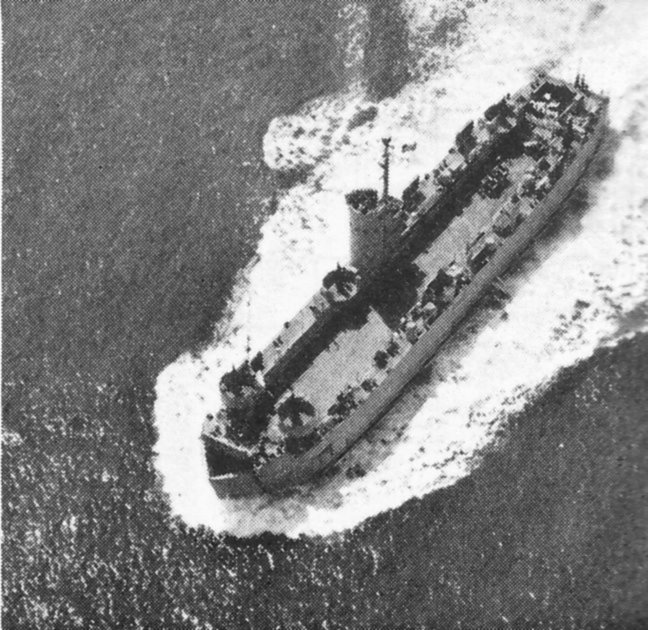 191k | Overhead views of USS LSM-201 underway in the Chesapeake Bay during her shakedown cruise in May 1944. US Navy photos from "Allied Landing Craft of World War Two", published by Arms and Armour Press. |