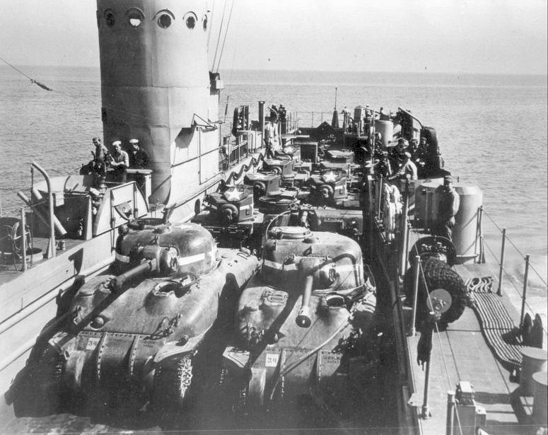 104k | USS LSM-201 underway in the Chesapeake Bay, 30 April 1944 with seven light tanks, two medium tanks, and fifty Army troops. US Navy photo # NH 228496 from the collections of the US Naval Historical Center. |