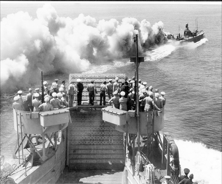 105k | USS LSM-201 behind a smoke screen while preparing for a mock amphibious landing at ATB Camp Bradford, VA., 11 May 1944. Note the number of officers observing. This was probably an exercise for the benefit of Army-Navy Staff College students at Camp Bradford. US Navy photo. |