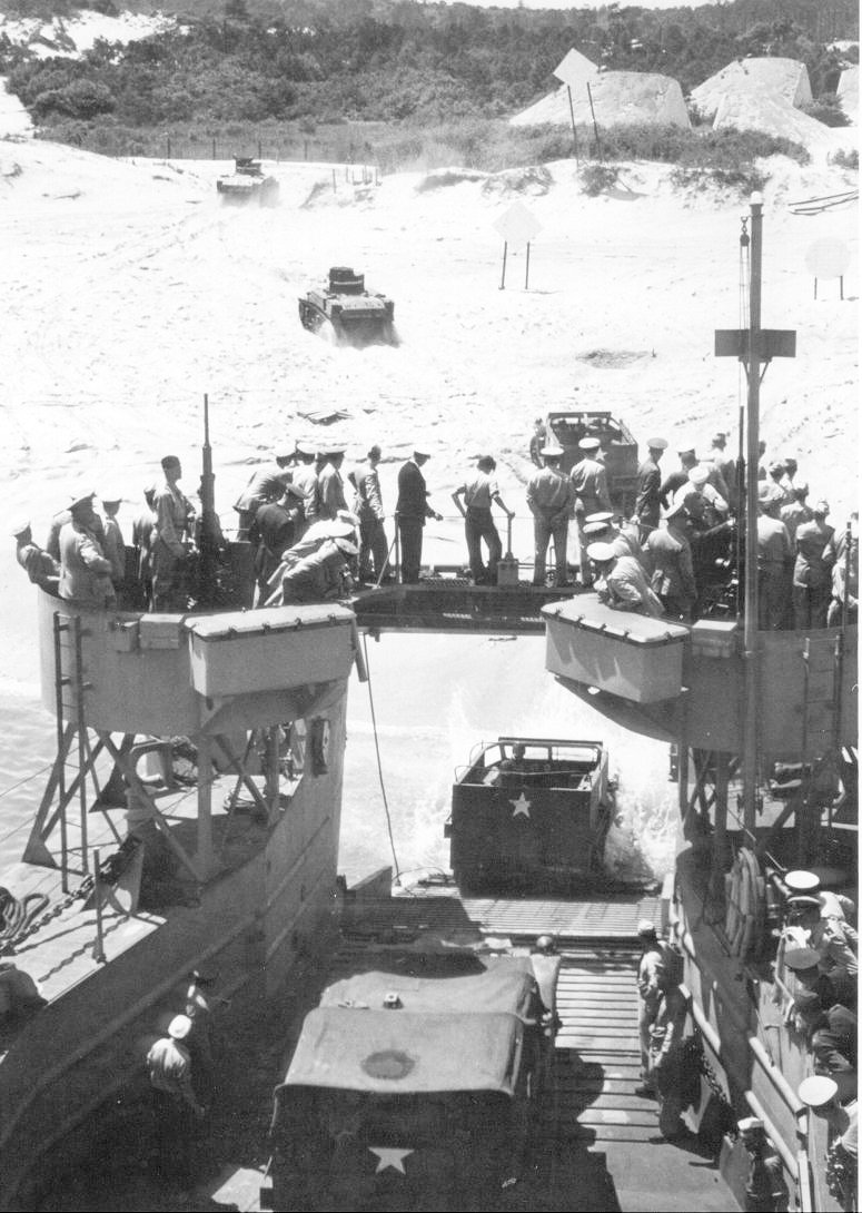161k | USS LSM-201 beached while off loading tanks and other vehicles during a mock amphibious landing at ATB Camp Bradford, VA., 11 May 1944. Note the number of officers observing. This was probably an exercise for the benefit of Army-Navy Staff College students at Camp Bradford. US Navy photo. |