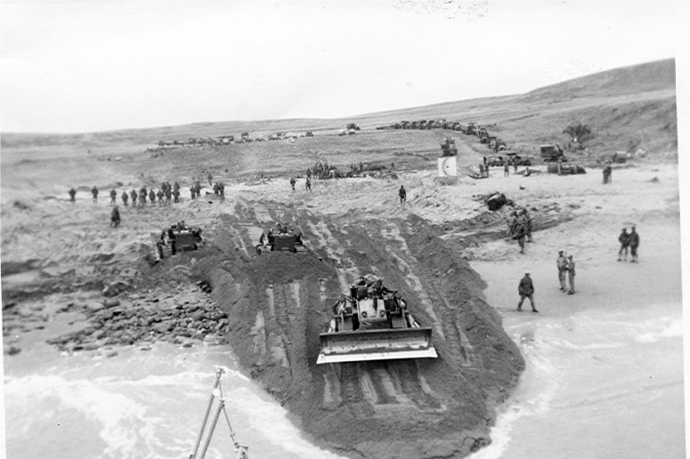 73k | Marines build ramp for USS LSM-226 to land and load equipment from the beach, San Clemente Island during a training exercise, circa 1950-51. Photo taken from LSM-226 | Donald Cutts, USS LSM-236 1950-51 | |