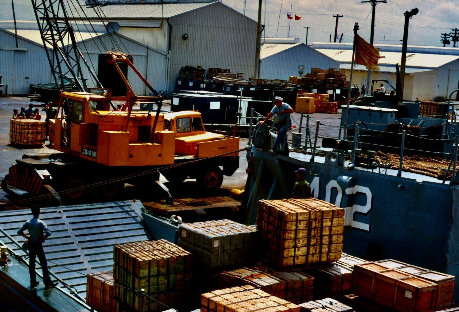 328k | RVNS Lam Giang (HQ-402) [ex-LSM-226] tied up astern of an LCM-8 being unloaded at Nha Be, RVN, circa 25 July 1971. | ©Richard Leonhardt | |