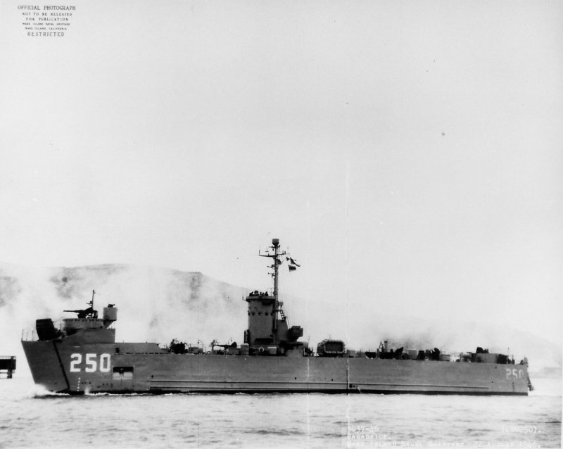 38k | USS LSM 250 off Mare Island Naval Shipyard. LSM-250 was under repair at the shipyard from 14 June to 31 August 1946 US Navy Yard Mare Island photo # 3040-46, dated 22 August 1946 |