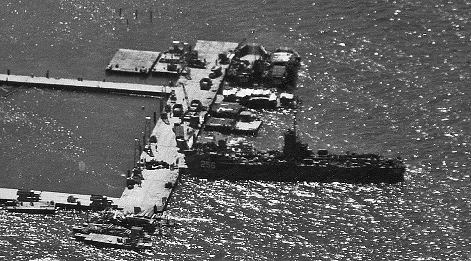906k | Aerial photo of USS LSM-256 at the pier at White Beach Okinawa, 17 June 1945. US Navy photo. |