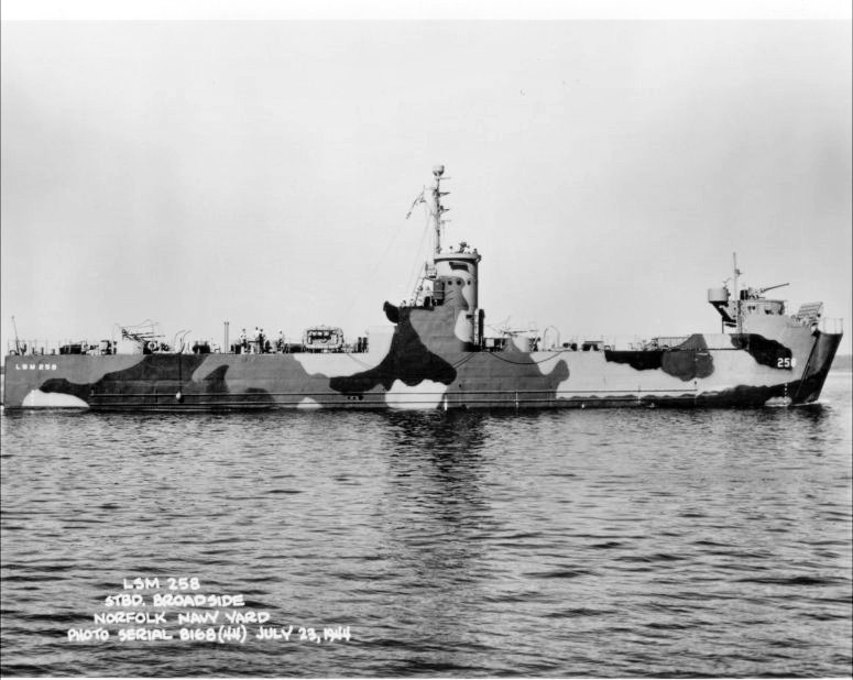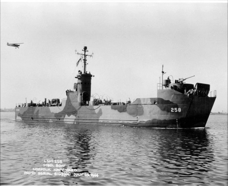 68k | USS LSM-258 under way, in Hampton Roads, 23 July 1944. starboard broadside view. Norfolk Navy Yard photo serial # 8168(44). |