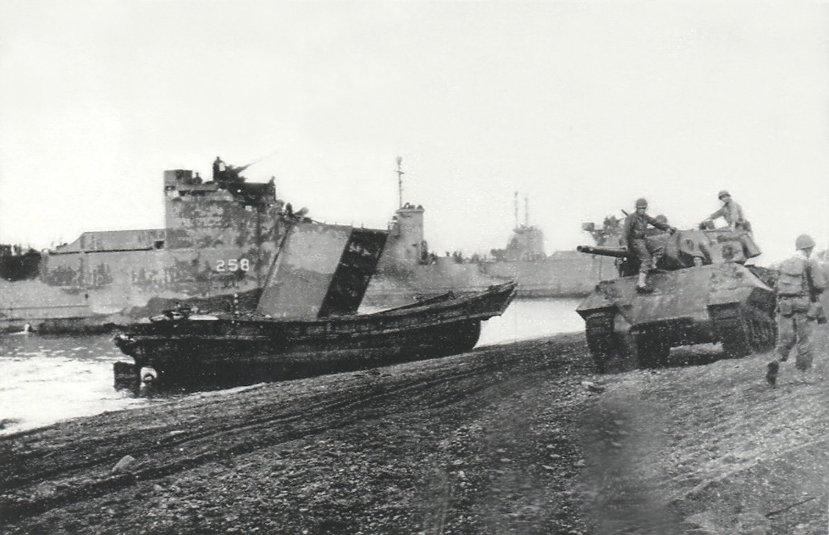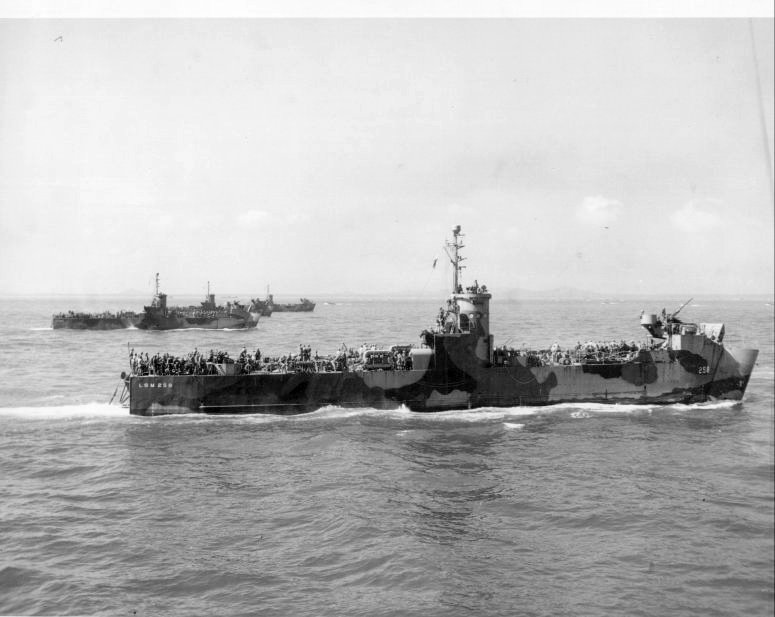 373k | USS LSM-258, USS LSM-34 and probably USS LSM-311 unloading troops and equipment during the invasion of the Philippine Islands. Twelve LSM’s composed Task Unit 78.2.5, the Task Unit departed Hollandia for Leyte, Friday 13 October 1944. Arrived without incident 20 October. USS LSM 311, USS LSM-34 and USS LSM-258 assigned white beach, two, beached at 1027. The Higgins boat in the foreground belongs to USS Arneb (AKA-56). | Brian Miller also Contributed in the name of Purl Allan Ferrier, S1c, SV-6 USNR, LSM-87 by Vicki Purl Ferrier-Taylor |