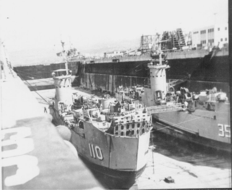 62k | USS LSM-110 and USS LSM-355 in dry dock, Long Beach, CA., circa March 1952 to 22 May, 1952. | Kenneth Oliver Photo Courtesy Jim Tusing LSM-372, Editor "Alligator Alley" The Newsletter of the USS LSM - LSMR Association |