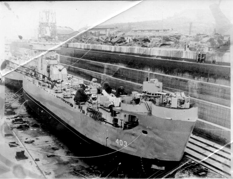 90k | USS LSM(R)-403 in dry dock, Sasebo, Japan, 1951. | Photo Courtesy Jim Tusing LSM-372, Editor "Alligator Alley" The Newsletter of the USS LSM - LSMR Association |