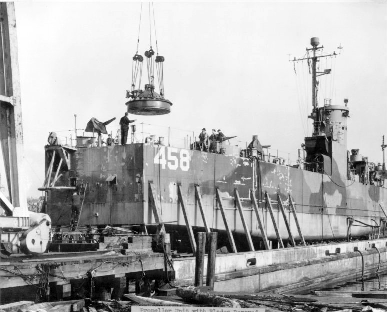 View USS LSM-458 just before lowering one of the cycloidal propellers into position at Everett Pacific Shipbuilding, Everett, WA., date unknown. |