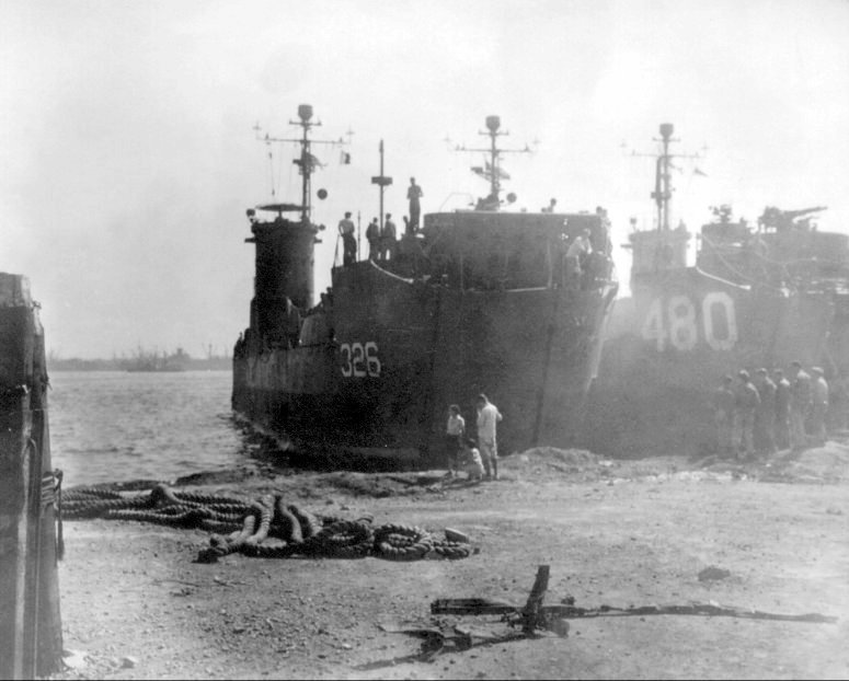 USS LSM-480 and USS LSM-326 beached at Yokohama, Japan, 20 October 1945. |