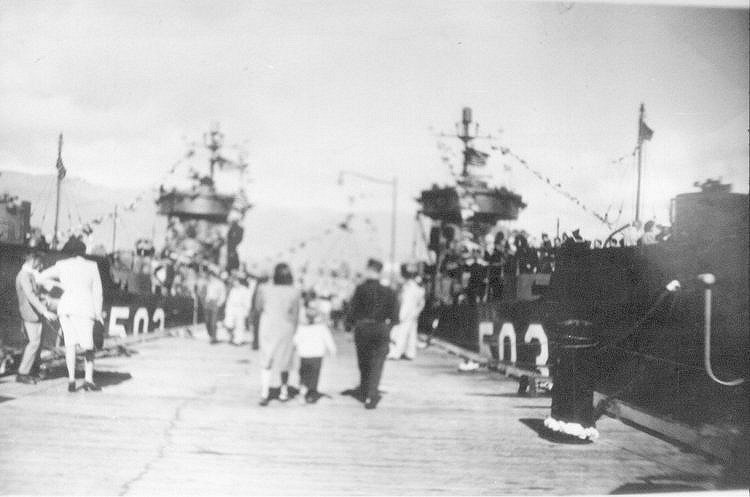 52k | USS LSM(R)-502 and USS LSM(R)-503 at Santa Barbara, Navy Day, 1945. | Lyle Miller, LSM(R)-502 Photo Courtesy Jim Tusing LSM-372, Editor "Alligator Alley" The Newsletter of the USS LSM - LSMR Association |