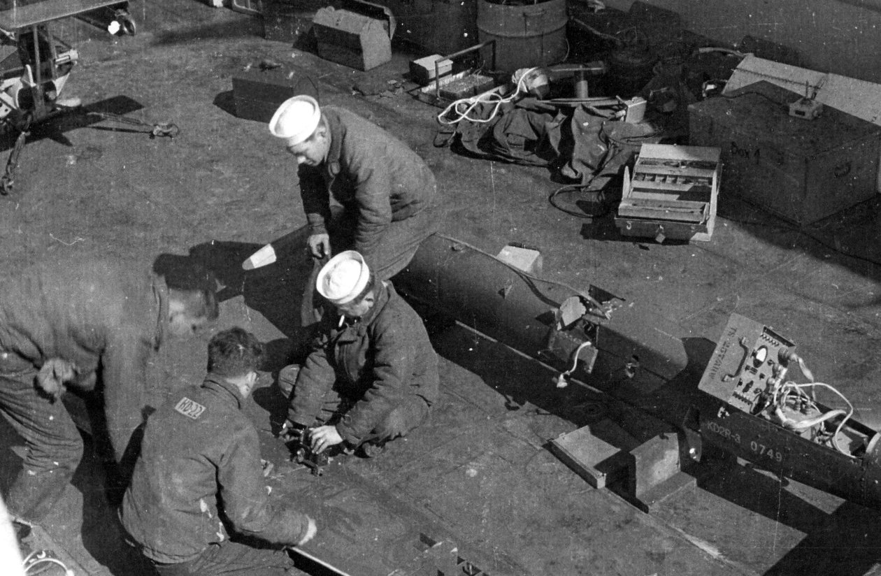 235k | USS LSM-546 crewmen preparing KD2R drone target planes for flight, date and location unknown. Each drone carried enough fuel for approximately 45 minutes of flight time. When their fuel was exhausted a parachute deployed to carry them back to the sea for recovery. US Navy photo |