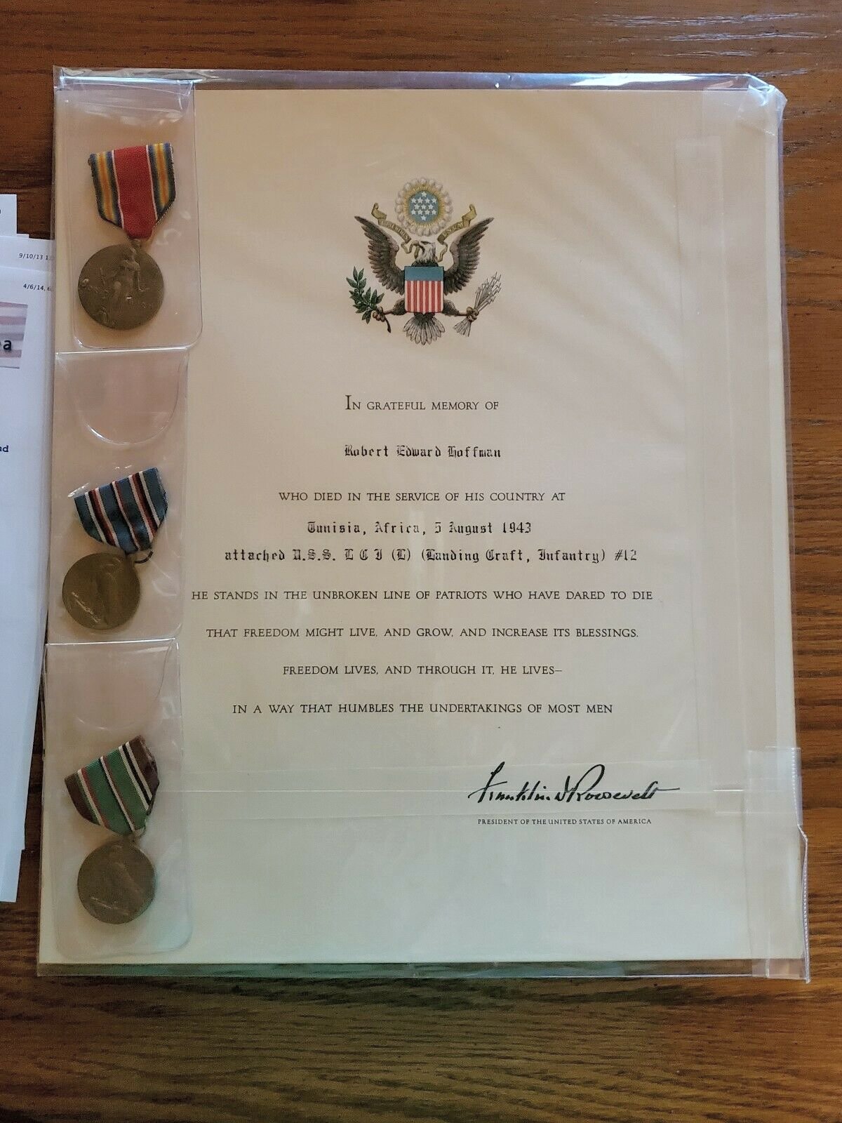 251k | An accolade (Certificate of Remembrance) presented to the family of Robert Edward Hoffman USS LCI(L)-12 who died at Tunisia, 5 August 1943. | Tommy Trampp | |