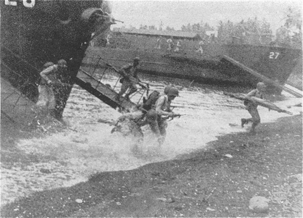 72k | US Marines disembark from USS LCI(L)-27 and USS LCI(L)-226 probably during a practice landing prior to the landing at Cape Gloucester, New Britain, 26-27 December 1943. Life-Time photo from "Life" issue of March 27, 1944. |