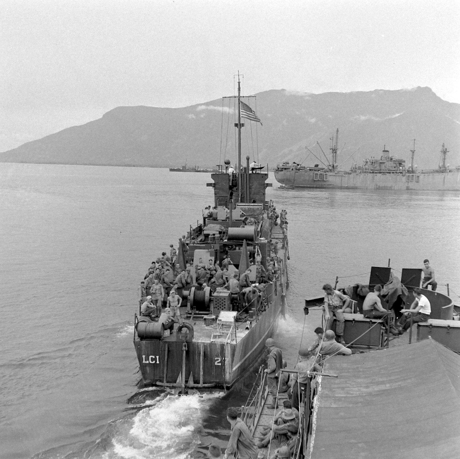 379k | USS LCI(L)-27 casts off and heads toward the beach at Saidor, New Guinea in January 1944.