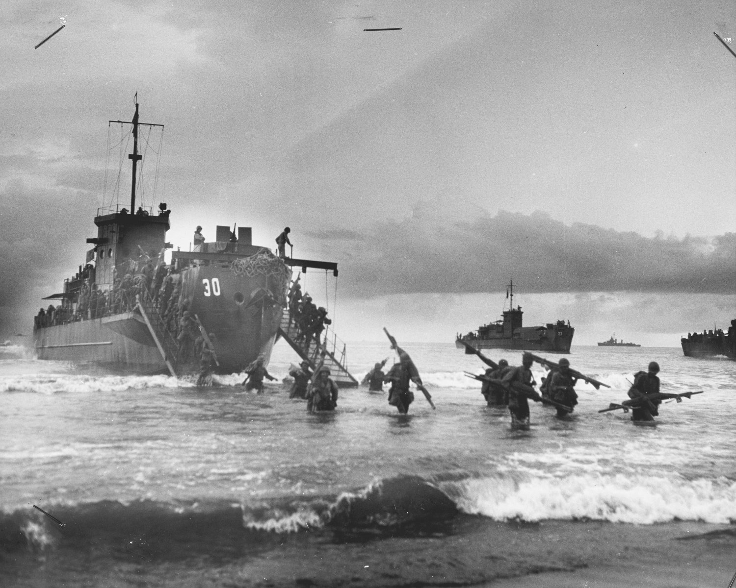 wading through the surf while in the background USS LCI(L)-27 makes her approach to the beach.