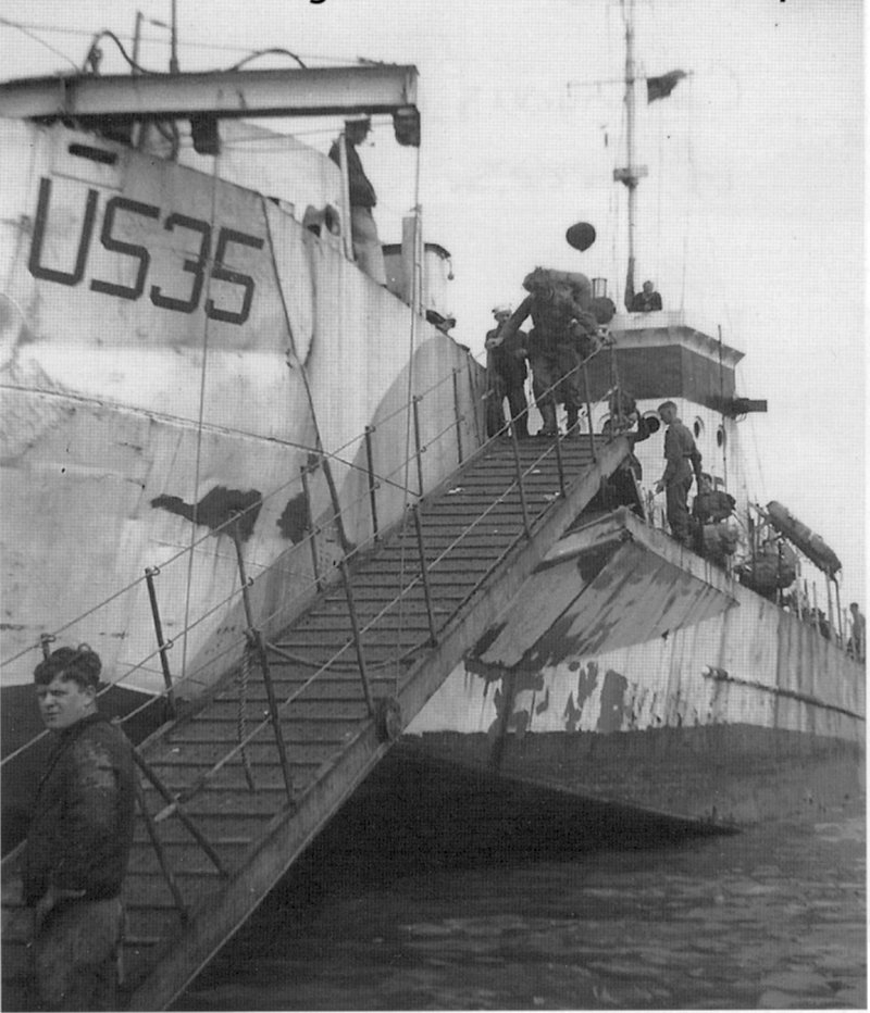 123k | USS LCI(L)-35 unloading troops in June 1944 at the Normandy beachhead. MoMM 2/c John J. Finnerty is standing at the bottom of
