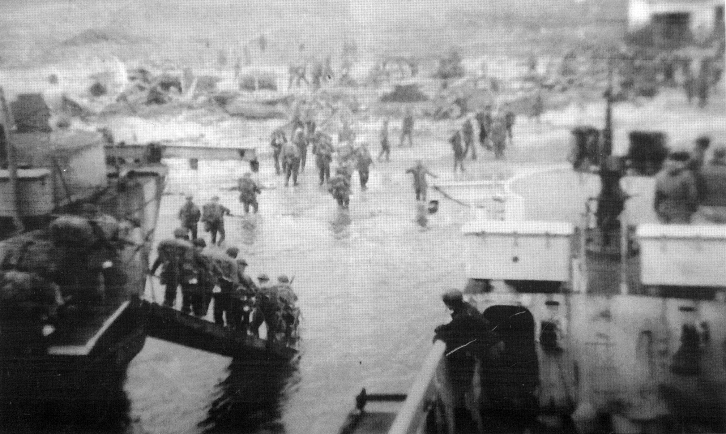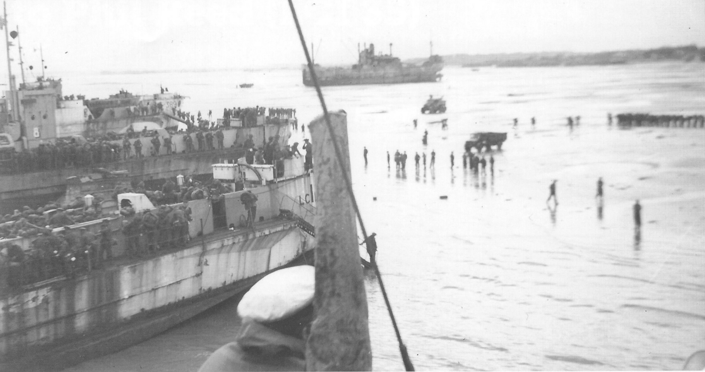 692k | USS LCI(L)-35 beached alongside another LCI(L) while unloading troops across the beach at Normandy, circa June 1944. Photo from the May 2015 issue of the USS LCI Association's newsletter "Elsie Item", courtesy Phil Reed. |