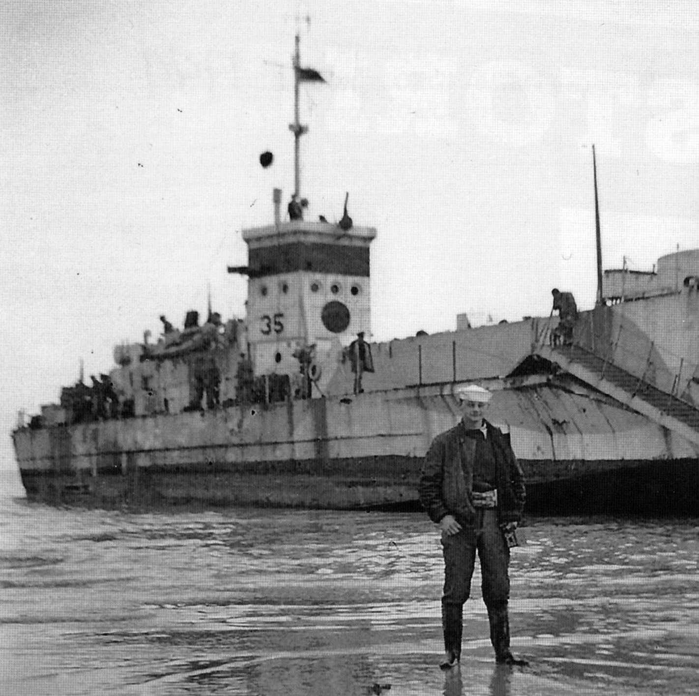 87k | USS LCI(L)-35 beached at the Normandy beachhead in June 1944. Standing on the beach are crew members John Finnerty (left)