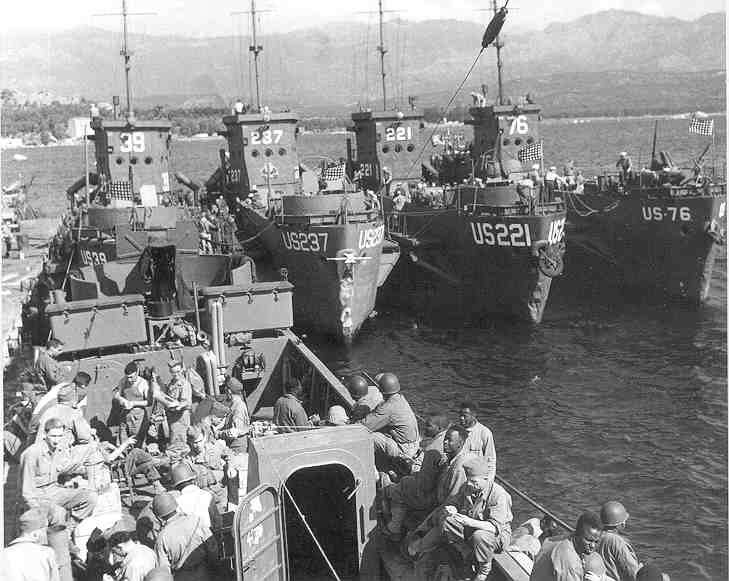 USS LCI(L)-39, USS LCI(L)-237, USS LCI(L)-221 and not visible, USS LCI(L)-76 U.S Army Pictorial Service photo # MM-44-1451 |