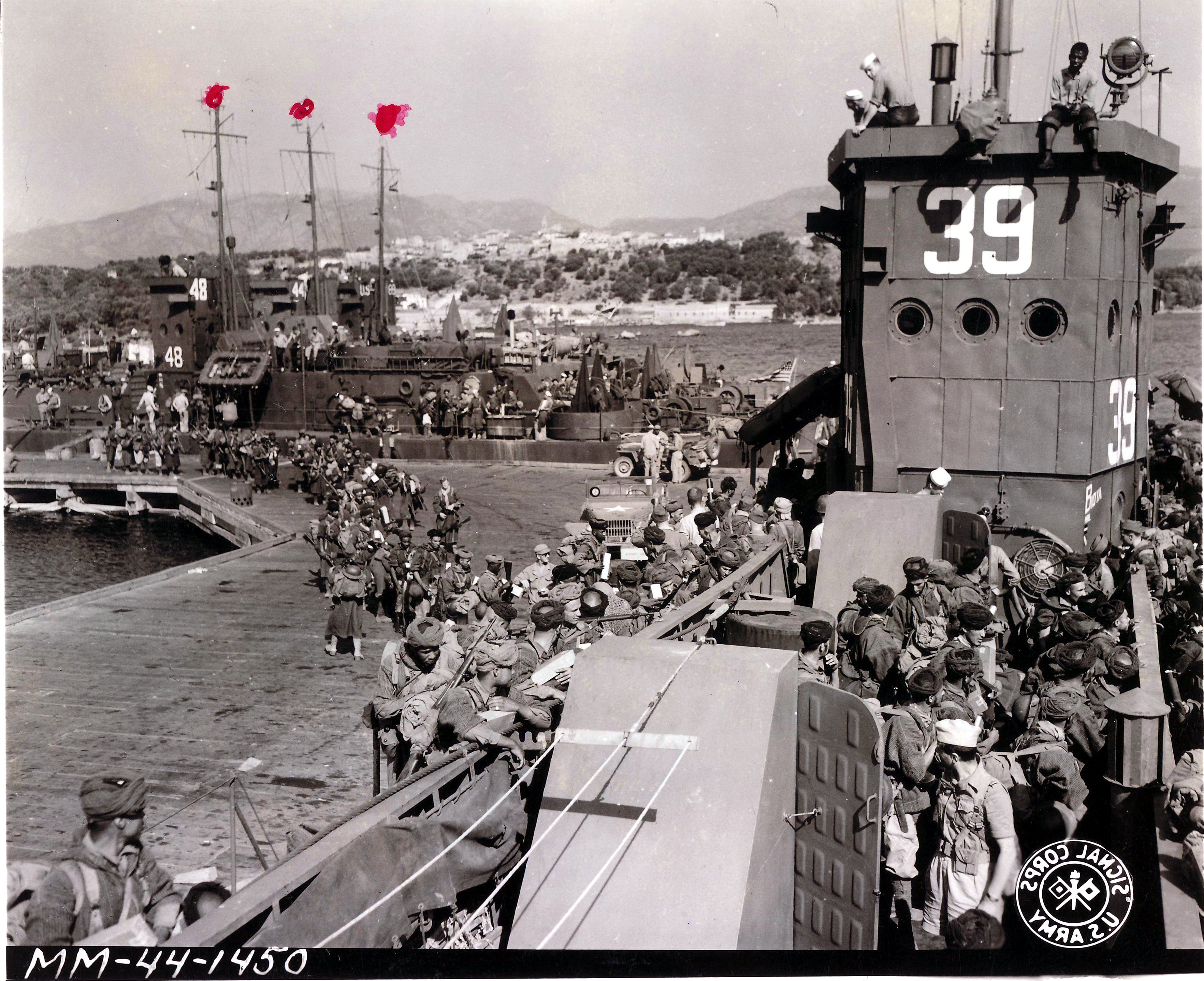 82k | Moroccan troops aboard landing craft at Porto Vecchio, Corsica, going to Elbe, 16 June 1944; USS LCI(L)-39, USS LCI(L)-237 and USS LCI(L)-221 |
