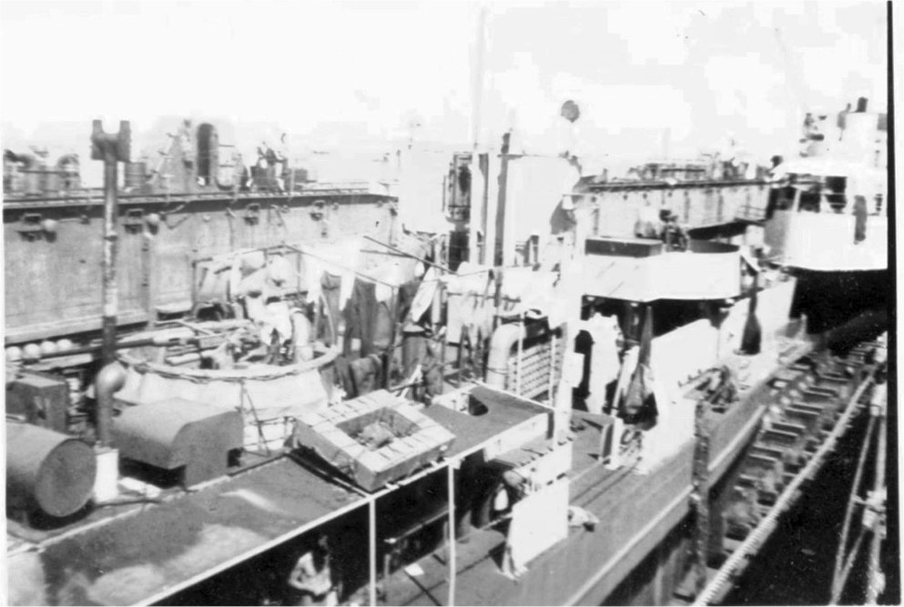 273k | Stern view of USS LCI(G)-65 and USS LCI(G)-64, at left, underway at Morotai in September 1944 during the Western New Guinea operation. Based on deck log information the two LCI(G)s in front of LCI(G)-65 may be USS LCI(G)-23) and USS LCI(G)-70 | Dean Reid, USS LCI(G) Affiliate, National USSLCI Association | |