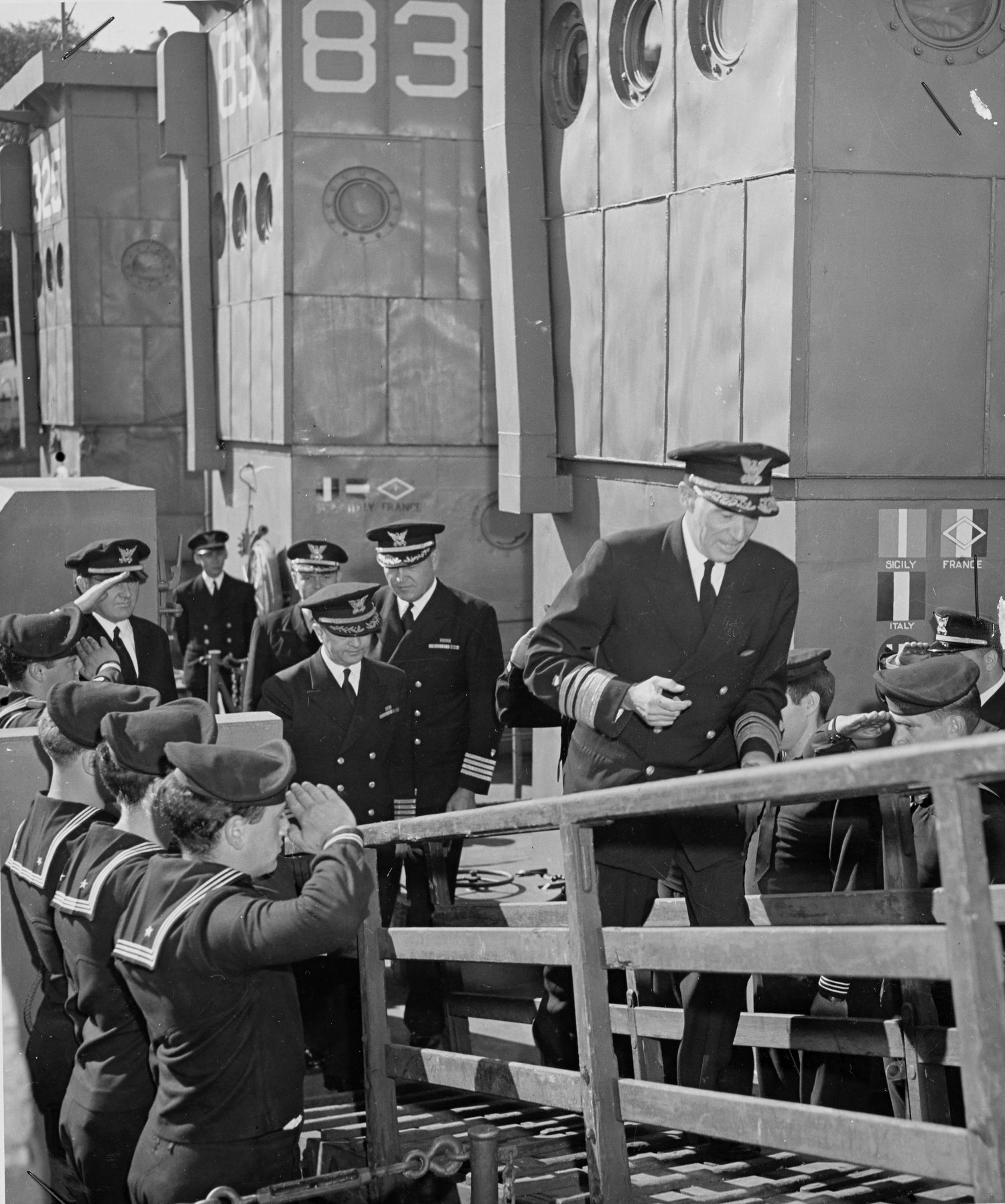 visited by VADM.Russell R. Waesche, (front) Commandant of the U.S. Coast Guard, seen here going ashore at Dartmouth, England,