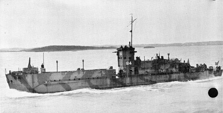 After participating in the invasion of France, USS LCI(L)-84 left the United Kingdom 4 October 1944, for Charleston, S.C., where she remained undergoing overhaul and repair until 15 December 1944. USS LCI(L)-84, now reassigned to the Asiatic Pacific Theater, LCI Flotilla 35, departed for San Diego via Key West and the Canal Zone and arrived there 18 April 1945. At San Diego USS LCI(L)-84 was attached to a ship training group at Coronado, CA,, from 23 January to 4 April1 1945 before proceeding to Okinawa via Pearl Harbor, Eniwetok, Guam, Ulithi and Leyte. At Okinawa USS LCI(L)-84) was assigned to carrying passengers and mail between nearby islands from 28 May to September 1945. USS LCI(L)-84 reached Wakayama 11 September 1945 becoming part of the Mine Destruction Unit in Kii Suido. Detached from that duty, 19 October 1945, she proceeded to Sasebo where on 26 October she was designated a mine disposal vessel on the "Skagway" sweeping operation in the East China Sea. She returned to Sasebo from this duty 1 November 1945, and remained there until the 12th when she proceeded to Nagoya. On 27 November she left Nagoya for Saipan, arriving 3 December 1945. Departing Saipan December 1945, she arrived at Galveston, Texas, 28 February 1946