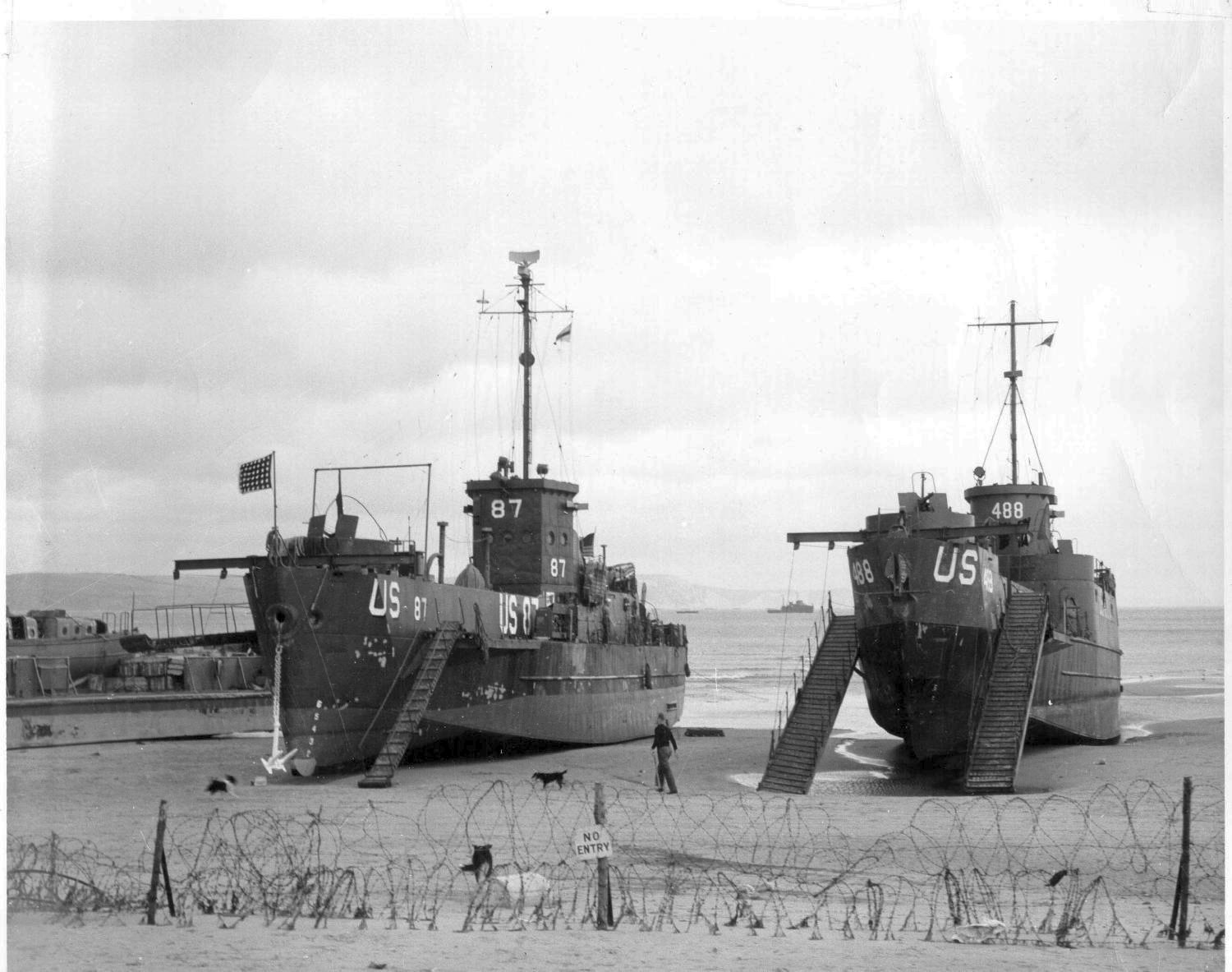 215k | USS LCI(L)-87 and USS LCI(L)-488 beached, probably at Slapton Sands, England, during the spring of 1944 while preparing for the Invasion of Normandy. US Coast Guard photo from the collections of the US Coast Guard Historian's Office |