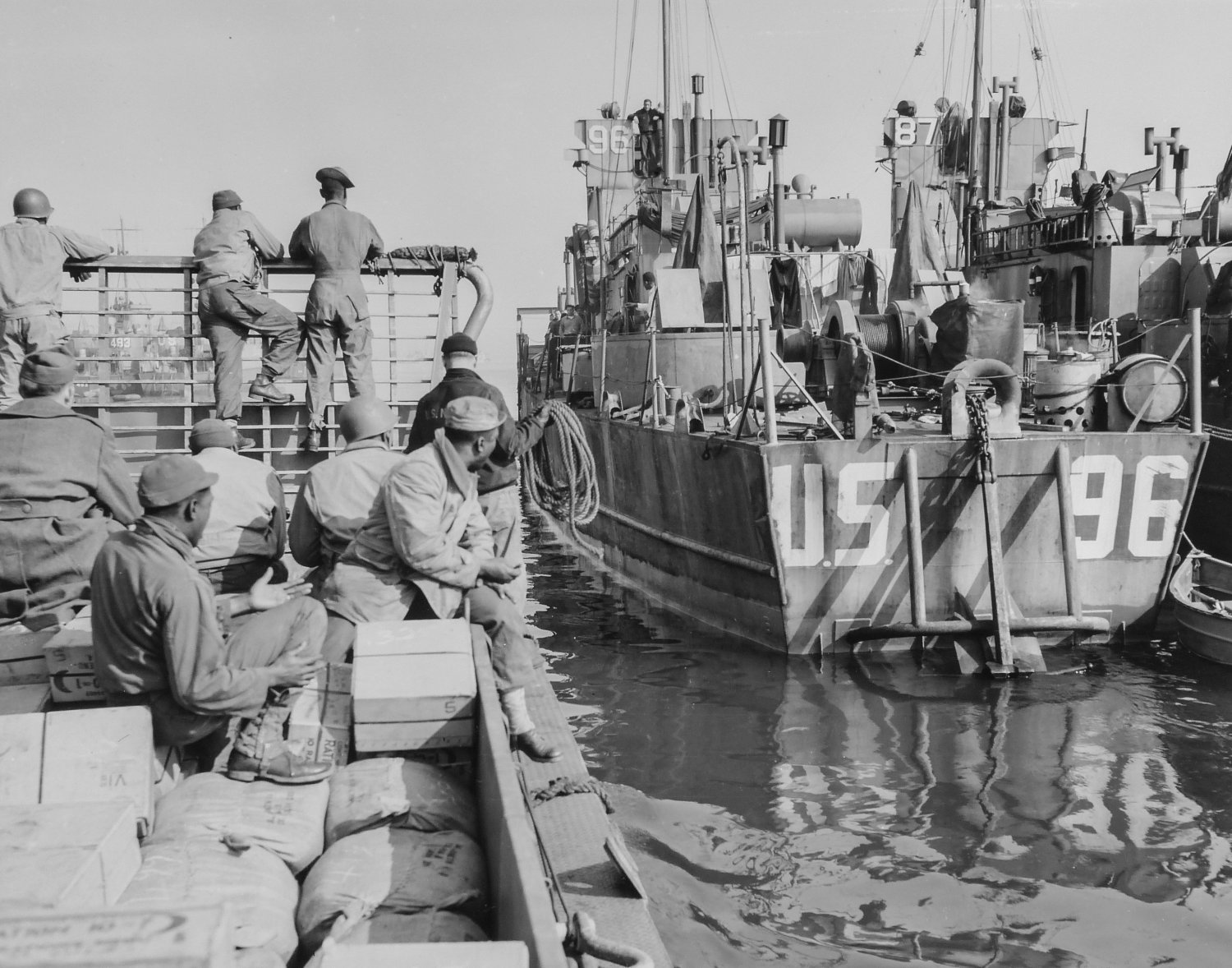 87k | Coast Guard LCI Flotilla 4, including USS LCI(L)-87 and USS LCI(L)-84 tied up in the background along with British landing craft, preparing to sail the English Channel and invade Nazi-occupied France. These landing craft landed US troops on Omaha Beach. USCG photo, date unknown. |
