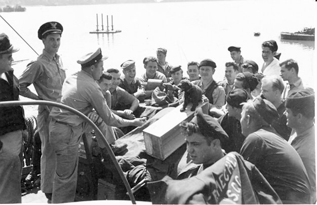 21k | USS LCI(L)-89's first stowaway puppy "Blackout" boarded the ship on his own at Falmouth, England, while the ship was preparing for the Normandy invasion. The first Blackout rode out the D-Day invasion on USS LCI(L)-89 and had to be "reassigned" to an Army platoon at a temporary air strip in France after the sea air started affecting his hide. US Coast Guard photo. |