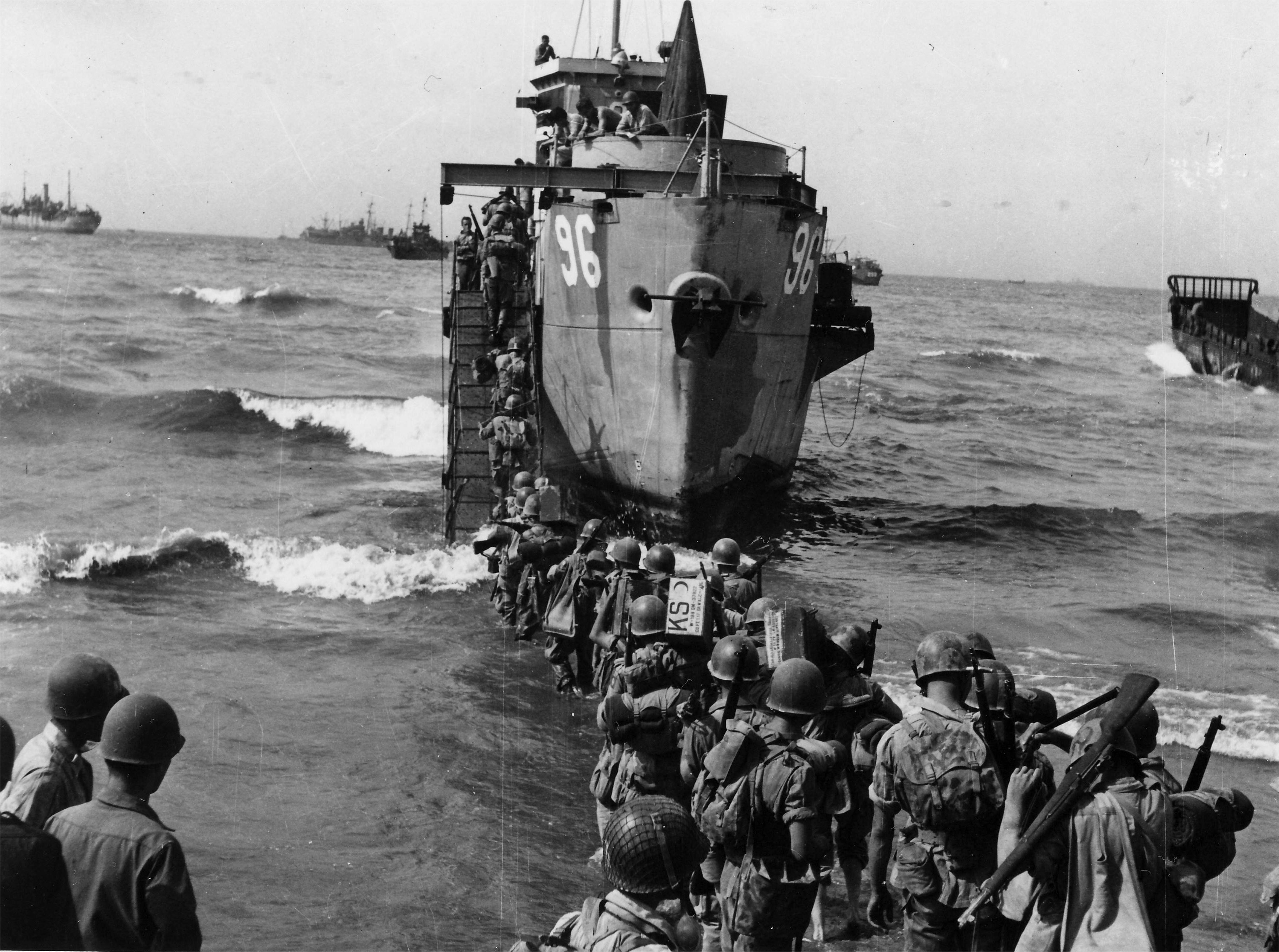 1183k | USS LCI(L)-96 beached near Paostum, Italy, 15 September 1943, while embarking 2nd Battalion 504 Airborne Infantry for transportation to an undisclosed destination. US Army Signal Corps photo SC 181952 now in the collections of the US National Archives. |