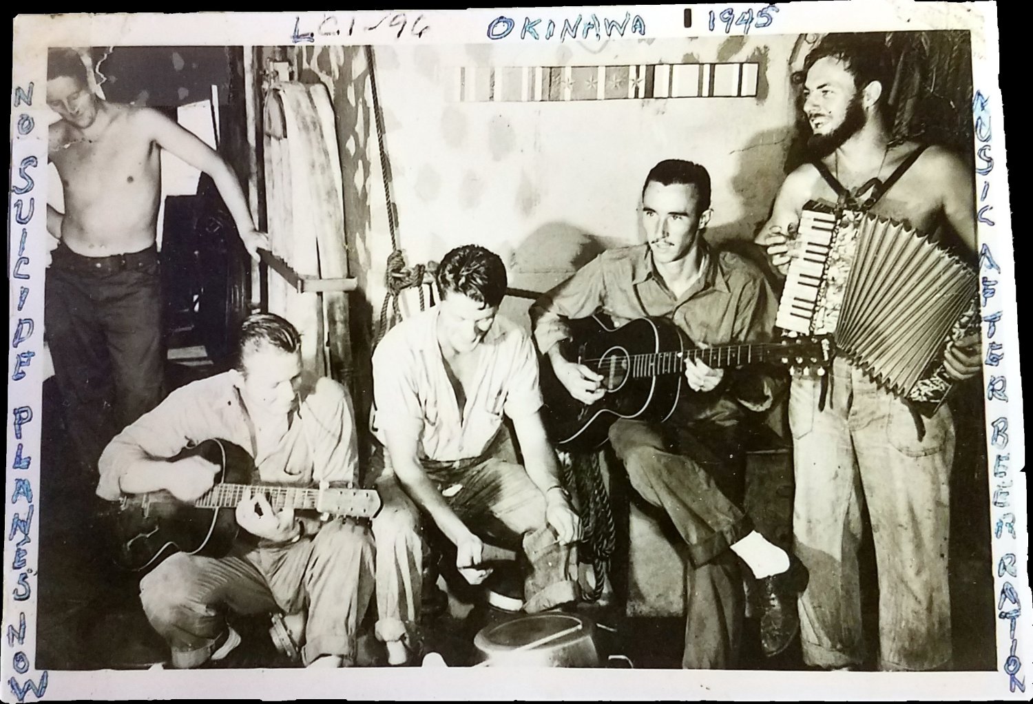 1015009607 | 305k | Several USS LCI(L)-96 crew members playing music, date and location unknown. | Joe Burden for his grandfather Charles J. Givens USS LCI(L)-96 | |