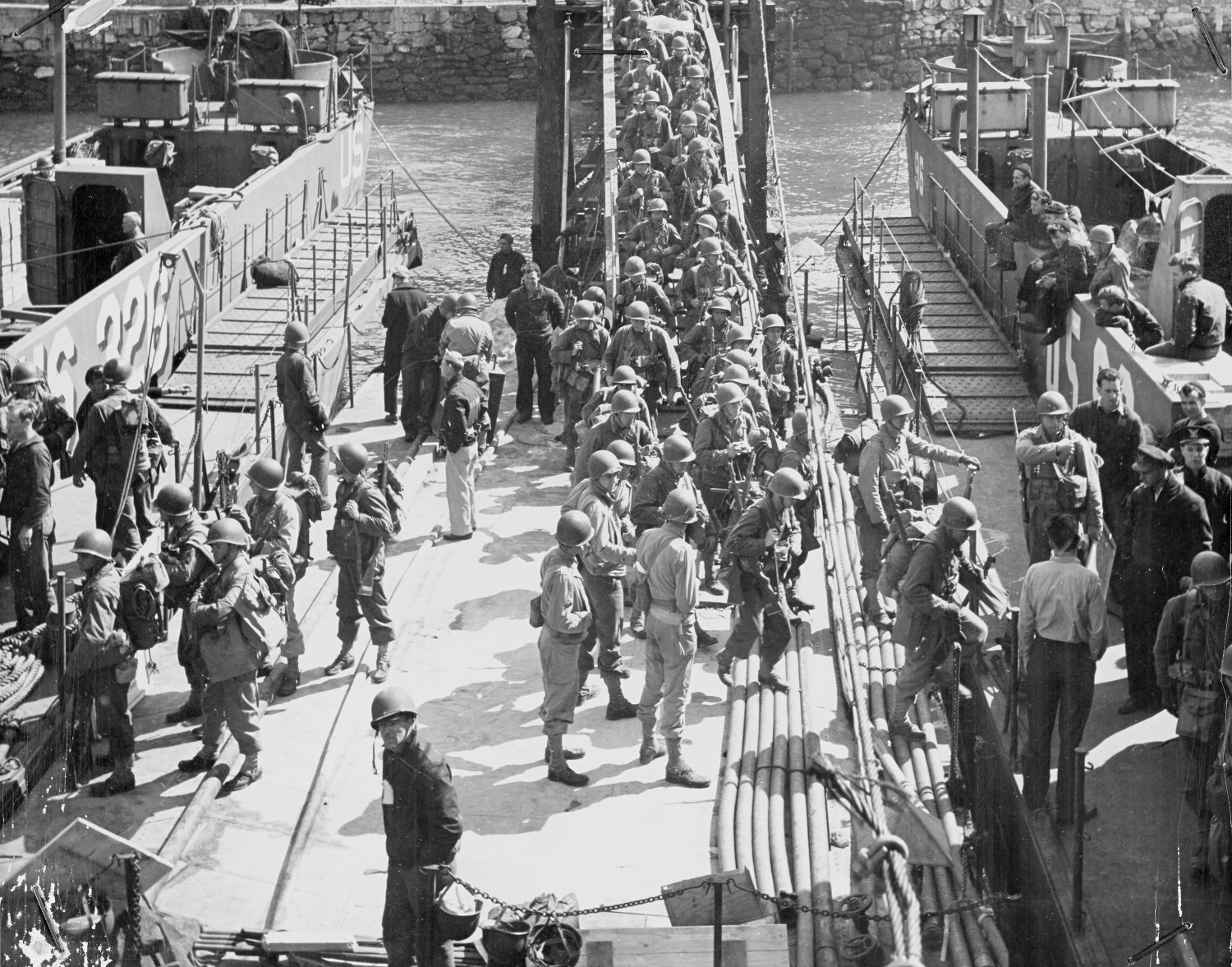 445k | US Army troops board USS LCI(L)-96 (right) and USS LCI(L)-326 (left) in an English port to