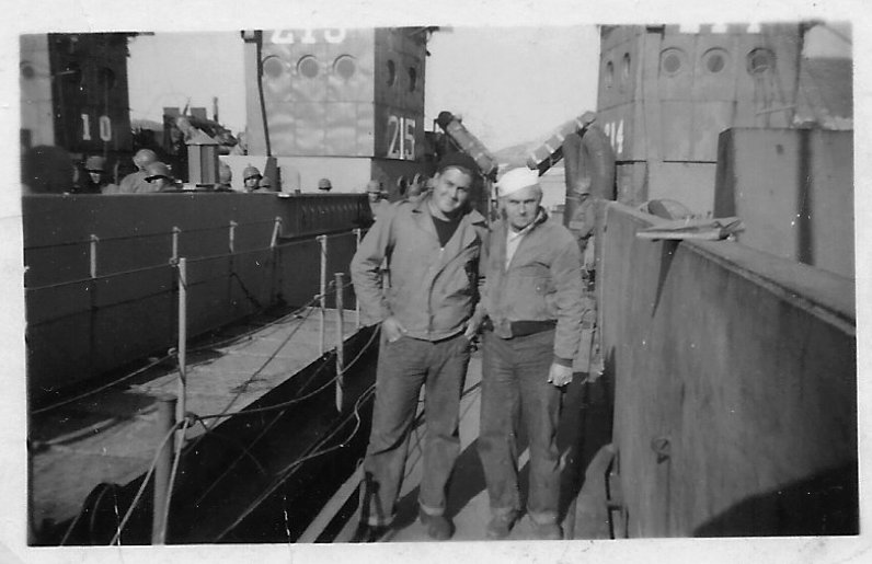 64k | USS LCI(L)-215 left and USS LCI(L)-214 at right with crew member Joseph G. Lind Jr. at right, unknown at left, probably at a port in England, circa 1944. | Joseph L. Lind, for his father Joseph G. Lind Jr. | |
