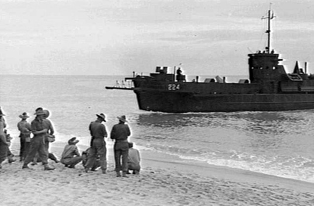 55k | USSLCI(L)-224 approaches Trinity Beach, QLD, Australia, 27 July 1943. The ship is part of an amphibious landing exercise
