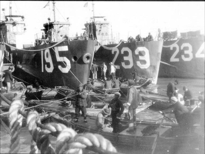 82k | USS LCI(G)-195, USS LCI(G)-233 and USS LCI(G)-234 moored at Saei, Formosa (Taiwan), and surrounded by bumboats, circa 13 December 1945 to 1 April 1946. | Photo courtesy Robert M. Norris | |