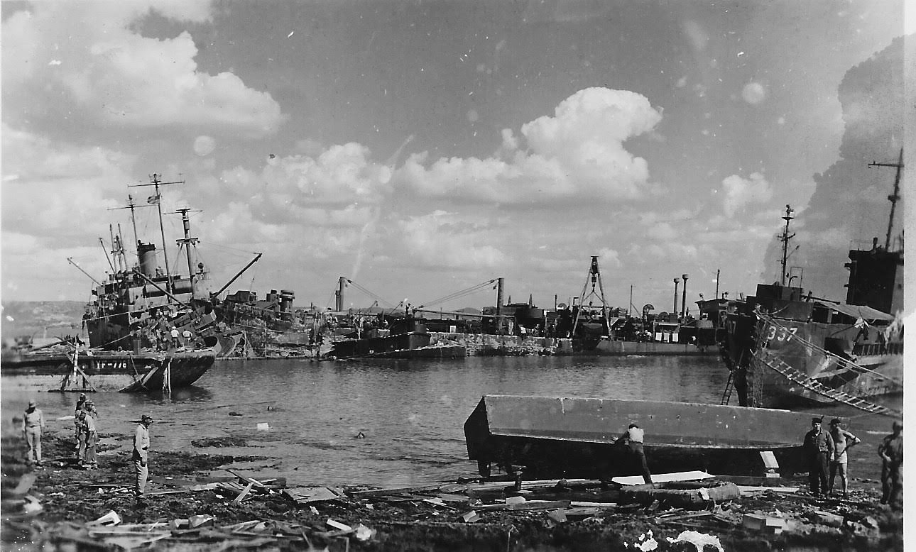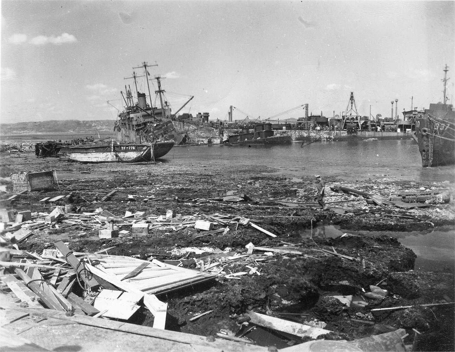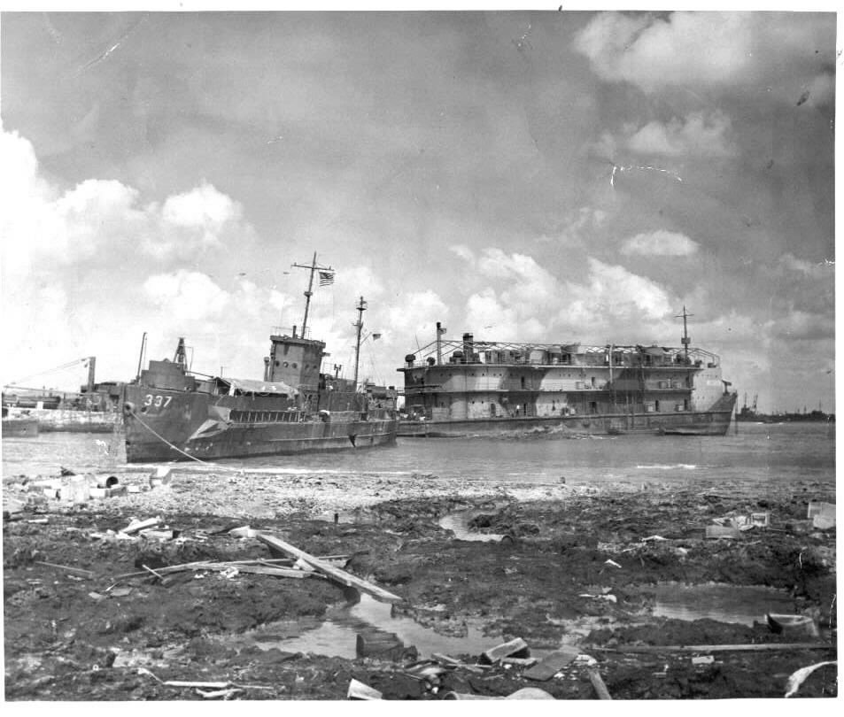 1106k | USS LCI(G)-463 and USS LCI(R)-337 high and dry at Buckner Bay, Okinawa, after Typhoon Louise blew thorough the port on 9 October 1945. | Donn Cuson | |