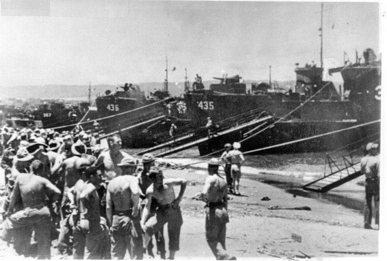 76k | USS LCI(L)-435 beached along with USS LCI(L)-436, USS LCI(L)-357 beached at Guadalcanal, in February 1944 along with numerous other LCIs, while crews relax on the beach. | Bill Brinkley | |