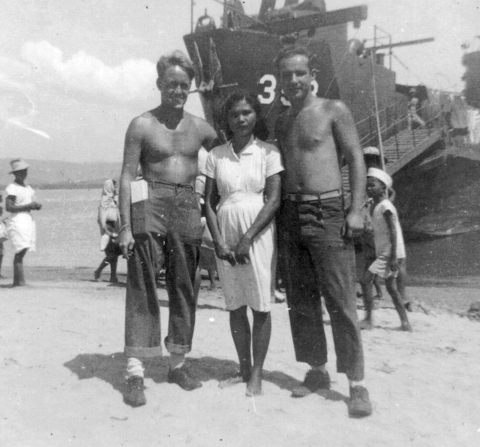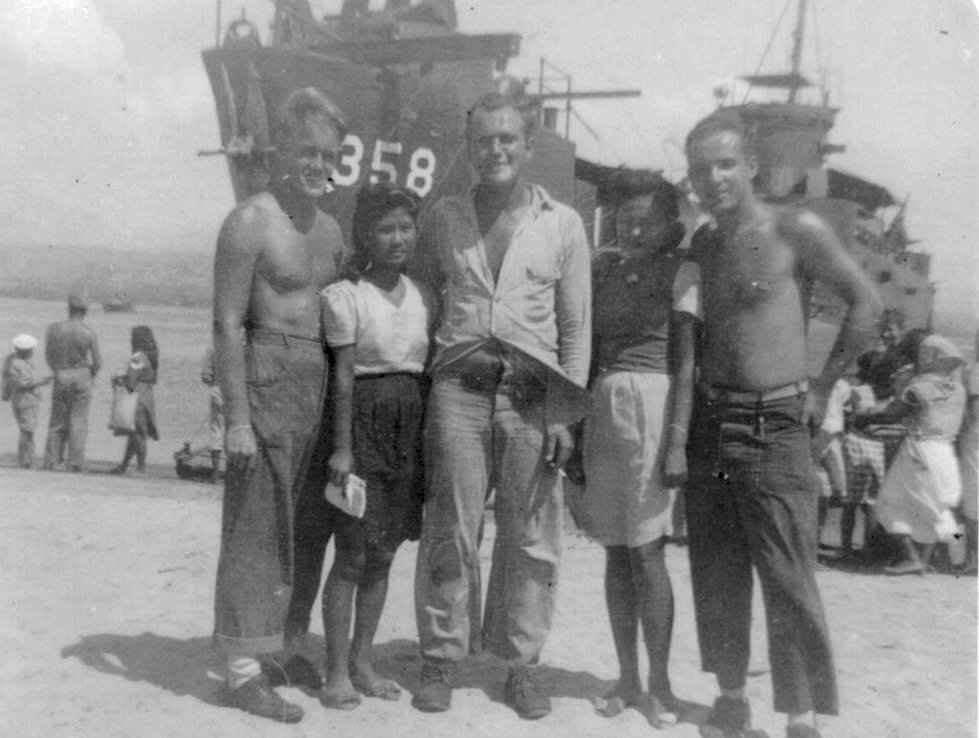 USS LCI(L)-358 beached, location unknown. Crew members posing with local Filipino girl, date unknown. Photo by James Gilbert Dudrow LCI(L)-358 |