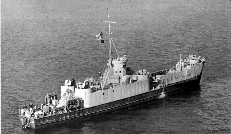 92k | USS LC(FF)-368 lies alongside USS LCI(G)-80 as the enter USS ABSD-6, at Guam, date unknown. US Navy photo |