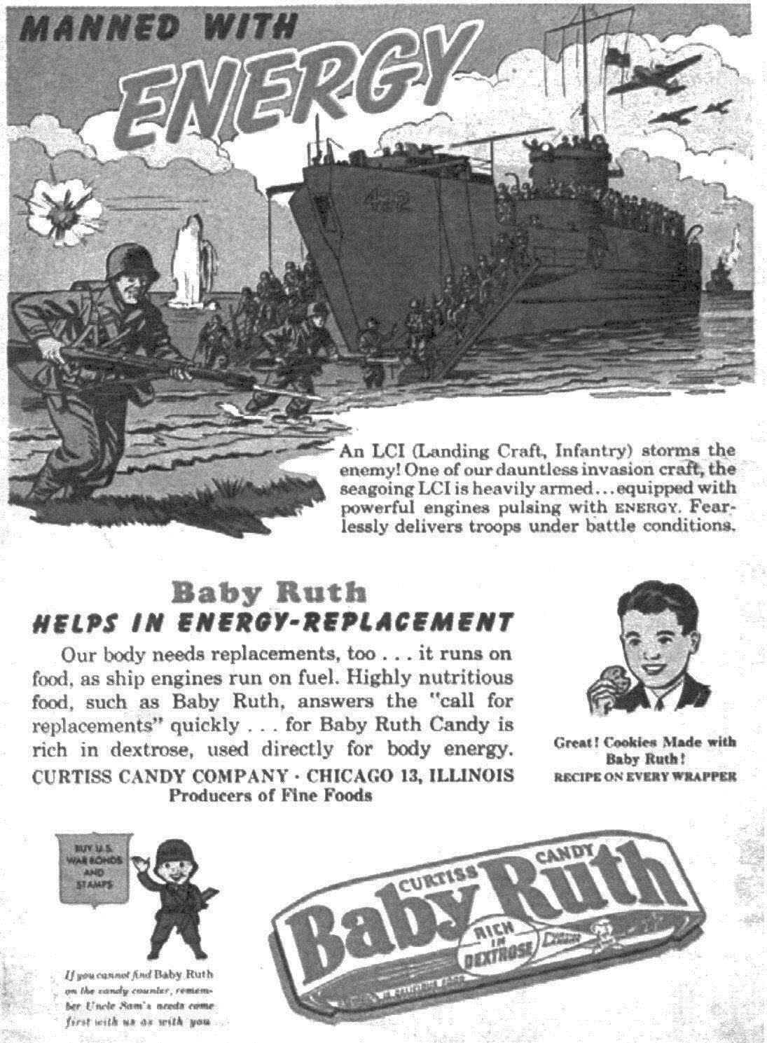 358k | A magazine ad for Baby Ruth candy bar showing USS LCI(G)-422 landing troops.
