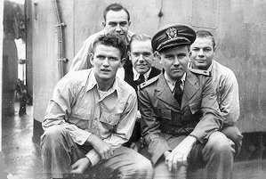 Left to right, Somewhere in the Pacific, Ens. Hermes, Alkire, LTjg Hudgins, Ens Kingdon Balzer, and Rooks |