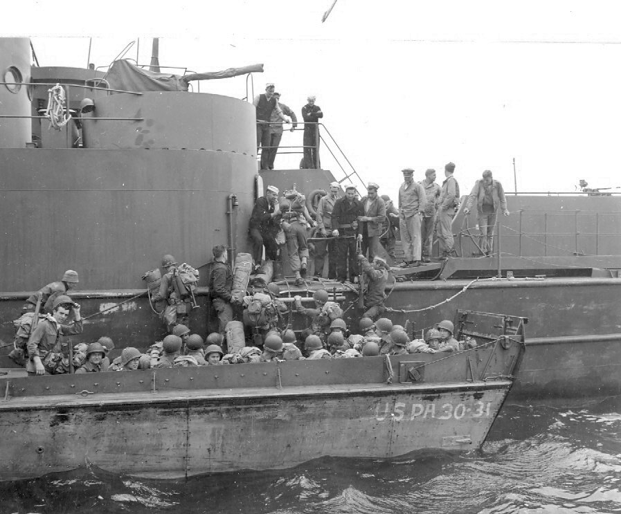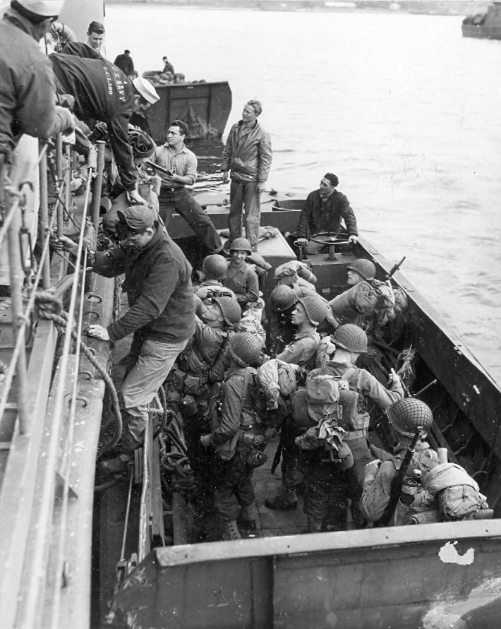 125k | US Army troops in full battle dress board USS LCI(L)-539 from an LCVP belonging to USS Thomas Jefferson (APA-30), circa 5 June 1944, in an English port in preparation for the invasion of Normandy. US Navy photo from the US National Archives. |