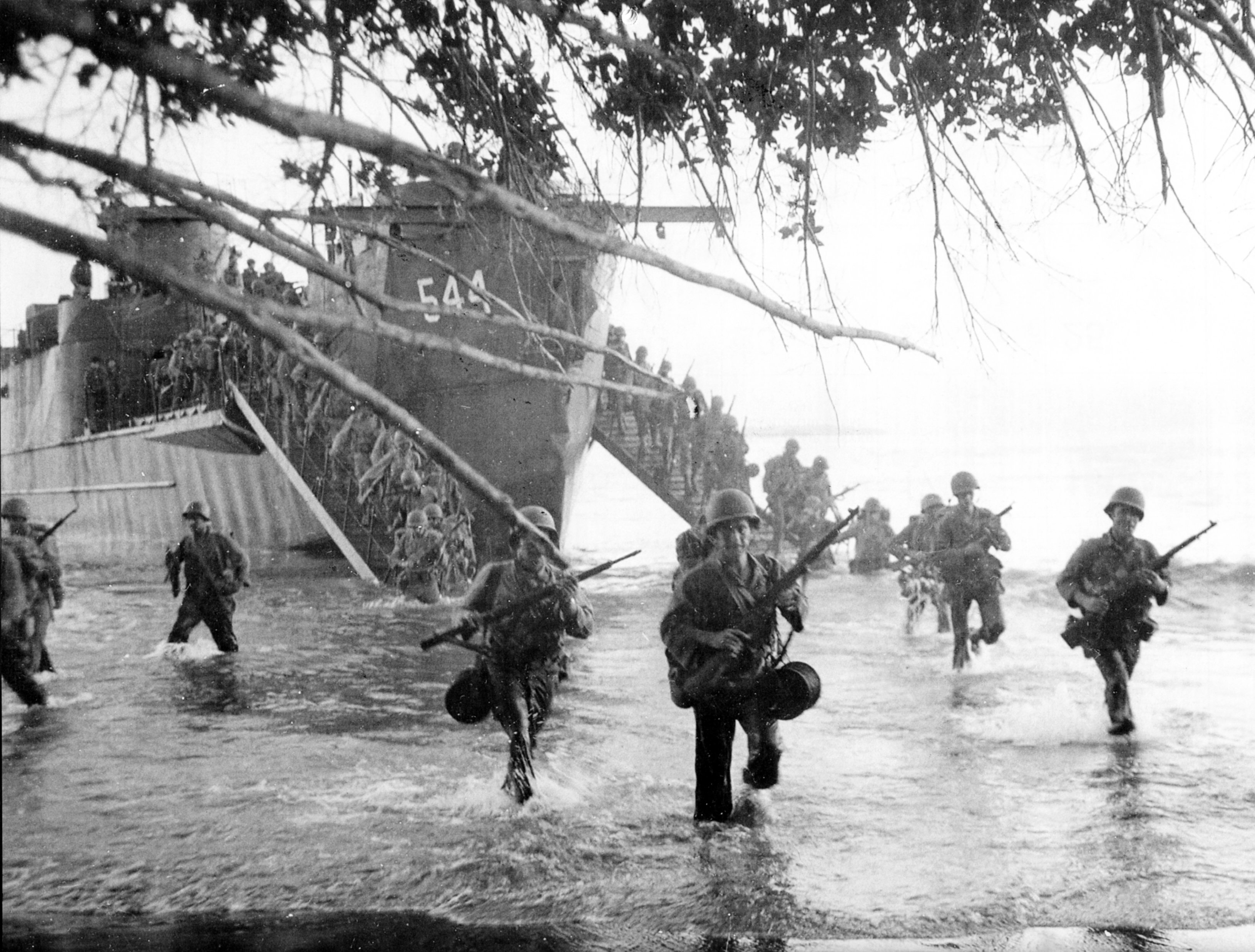 1228k | USS LCI(L)-544 landing 6th Division troops at Cape Sansapor, New Guinea, 30 July 1944. Photo from USS LCI National Association's 2009 calendar, a US Navy photo from the US National Archives, courtesy Dennis Blocker. |