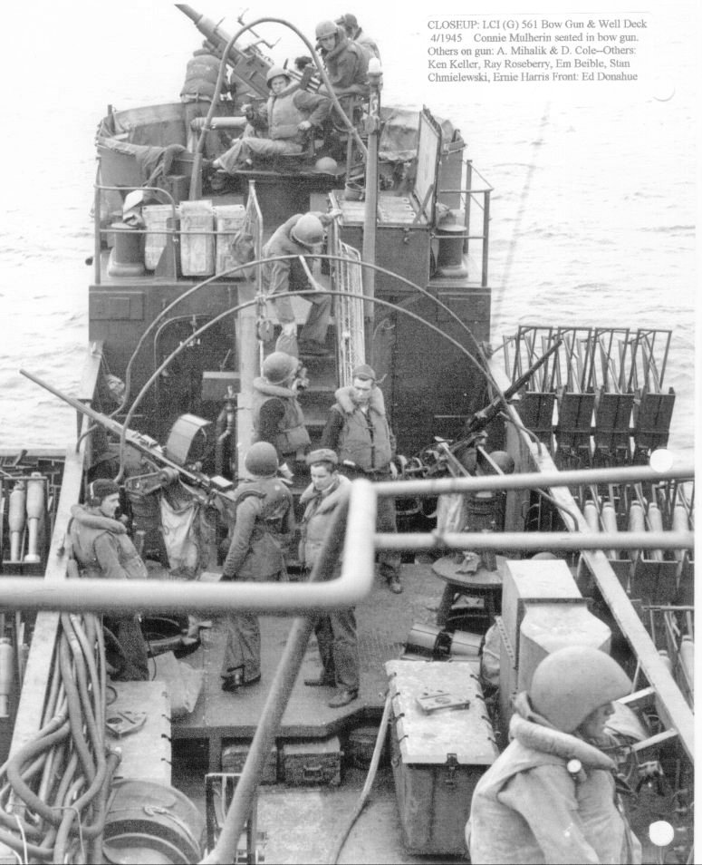 148k | USS LCI(G)-561 off Okinawa, April 1945. looking forward from the conning tower toward 40mm bow gun and the two forward 20mm guns. Crew members on the guns include Connie Mulherin seated in bow gun, others on the gun include, A. Mihalik and D. Cole. On the 20 mm guns, Ken Keller, Ray Roseberry, Em Beible, Stan Chmielewski, Ernie Harris, talker in foreground is Ed Donahue. Note the port and starboard rocket launchers are loaded. | Photo by Ens. Mel Zolkover USS LCI(G)-561 | |